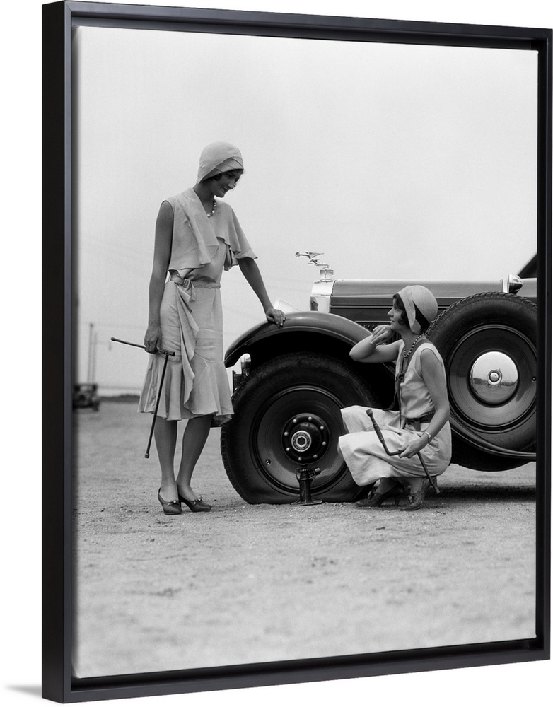 <p>1930s Two Women Confront An Automobile Flat Tire.</p>