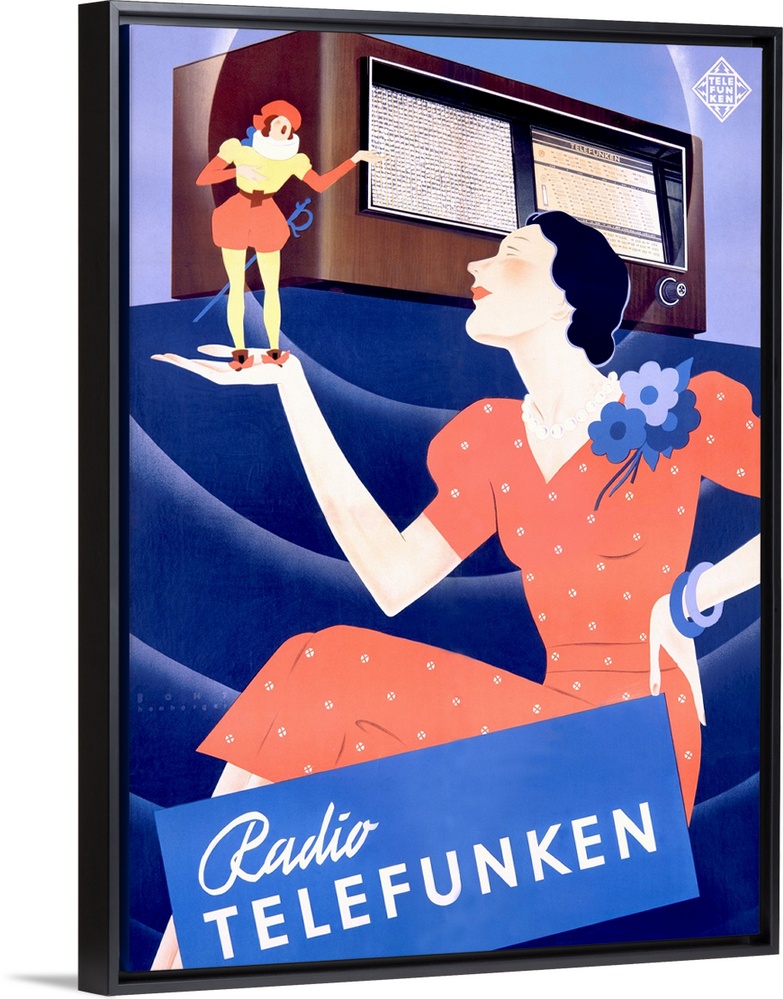 <p>This elegant Art Deco advertisement for Telefunken radios features a refined woman in a red polka-dotted dress admiring a miniature Harlequin figure who stands confidently on her hand-symbolizing the magic of voice emerging from the radio. The geometric background, stylized figures, and limited pastel palette exemplify streamlined modernity and leisure culture of pre-war Europe. The poster visually equates the cutting-edge technology of Telefunken with charm, sophistication, and entertainment, capturing the aspirational lifestyle of the 1930s.</p>