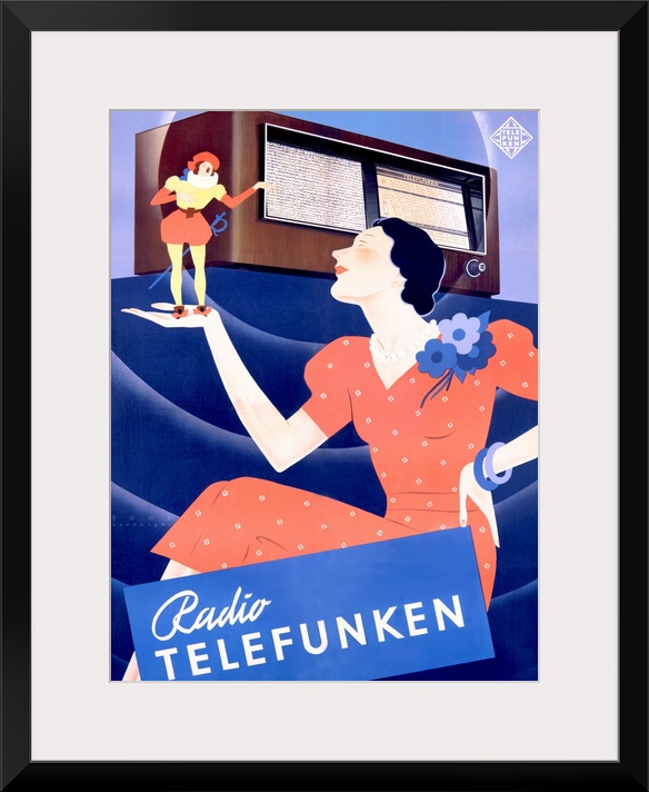 <p>This elegant Art Deco advertisement for Telefunken radios features a refined woman in a red polka-dotted dress admiring a miniature Harlequin figure who stands confidently on her hand-symbolizing the magic of voice emerging from the radio. The geometric background, stylized figures, and limited pastel palette exemplify streamlined modernity and leisure culture of pre-war Europe. The poster visually equates the cutting-edge technology of Telefunken with charm, sophistication, and entertainment, capturing the aspirational lifestyle of the 1930s.</p>