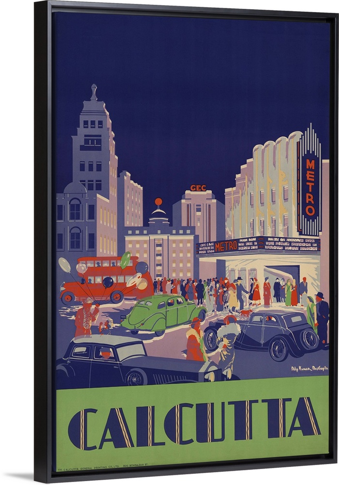 <p>1938 travel poster shows people gathered by the newly opened Metro Cinema in Calcutta.</p>