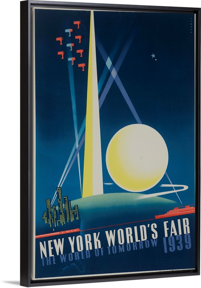 <p>1939 New York World's Fair poster showing spotlit Trylon and Perisphere with air show and city skyscrapers. illustrated by Joseph Binder.</p>