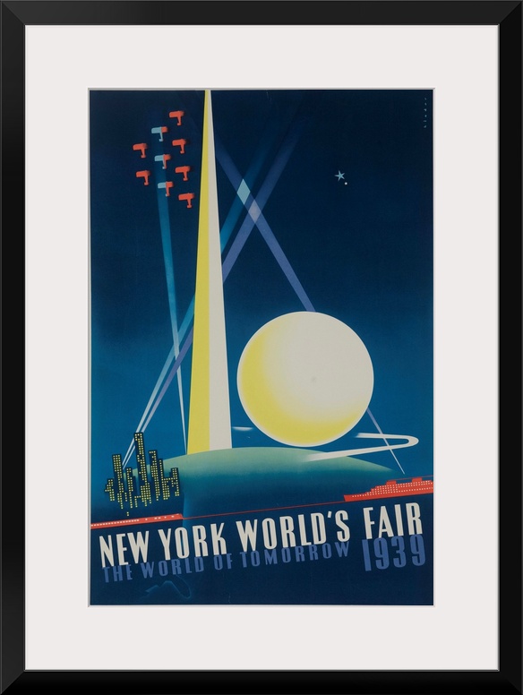 <p>1939 New York World's Fair poster showing spotlit Trylon and Perisphere with air show and city skyscrapers. illustrated by Joseph Binder.</p>