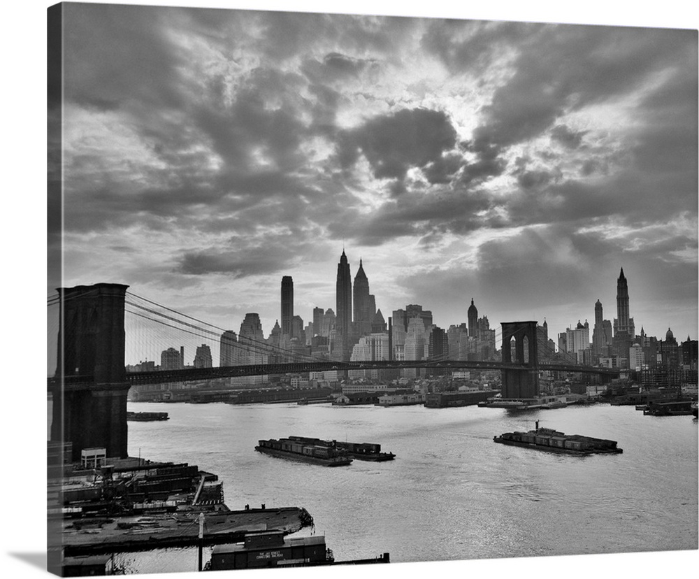 <p>1940's 1950's Dramatic Sunset Downtown New York City Skyline With Brooklyn Bridge Barges In East River NYc NY USA.</p>