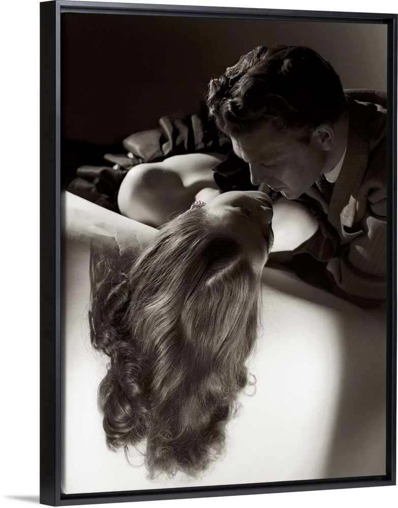 <p>1940s 1950s Anonymous Silhouetted Romantic Couple Embracing About To Kiss Sitting On Sofa.</p>