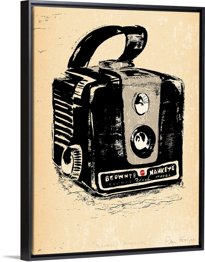 <p>1940's vintage style wall art of a kodak brownie camera illustrated in black ink wash on distressed sepia paper.</p>