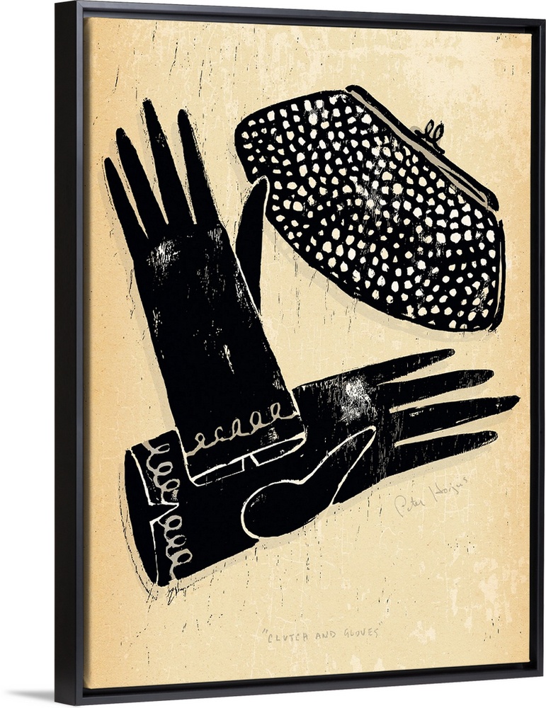 <p>1940's vintage style wall art of a clutch purse and gloves illustrated in black ink wash on distressed sepia paper.</p>