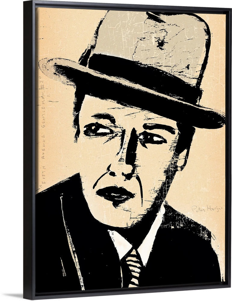 <p>1940's vintage wall art black ink brush illustration on sepia background of a dapper gangster man wearing a bowler hat.</p>