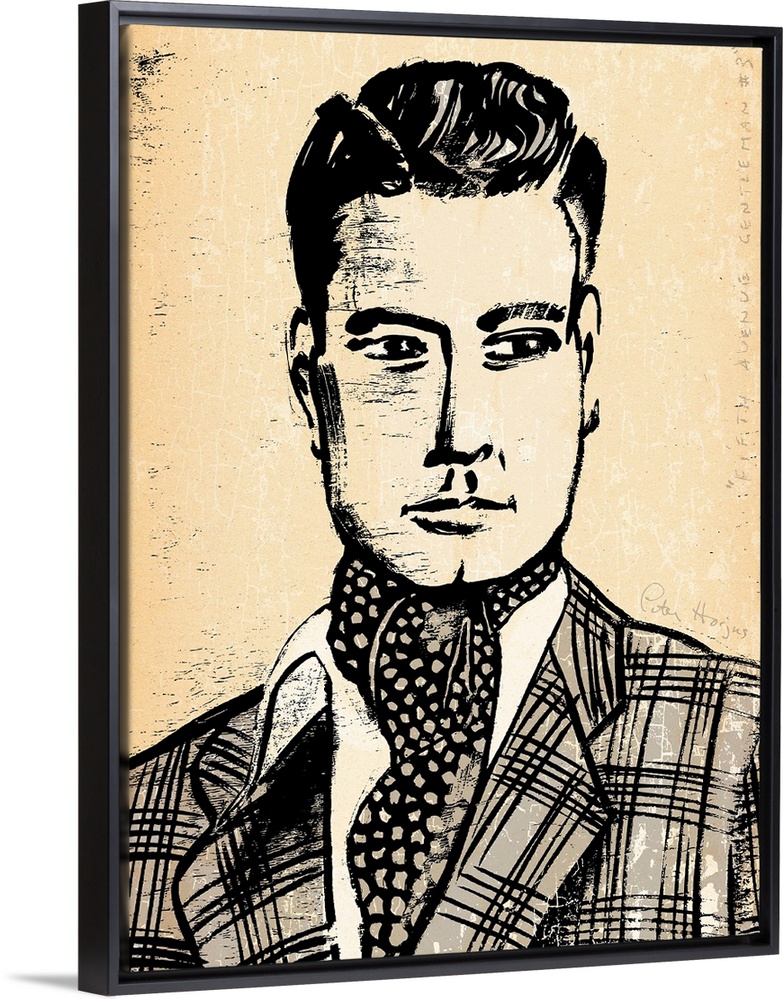 <p>1940's vintage wall art black ink brush illustration on sepia background of a dapper man with fashion coat and ascot.</p>
