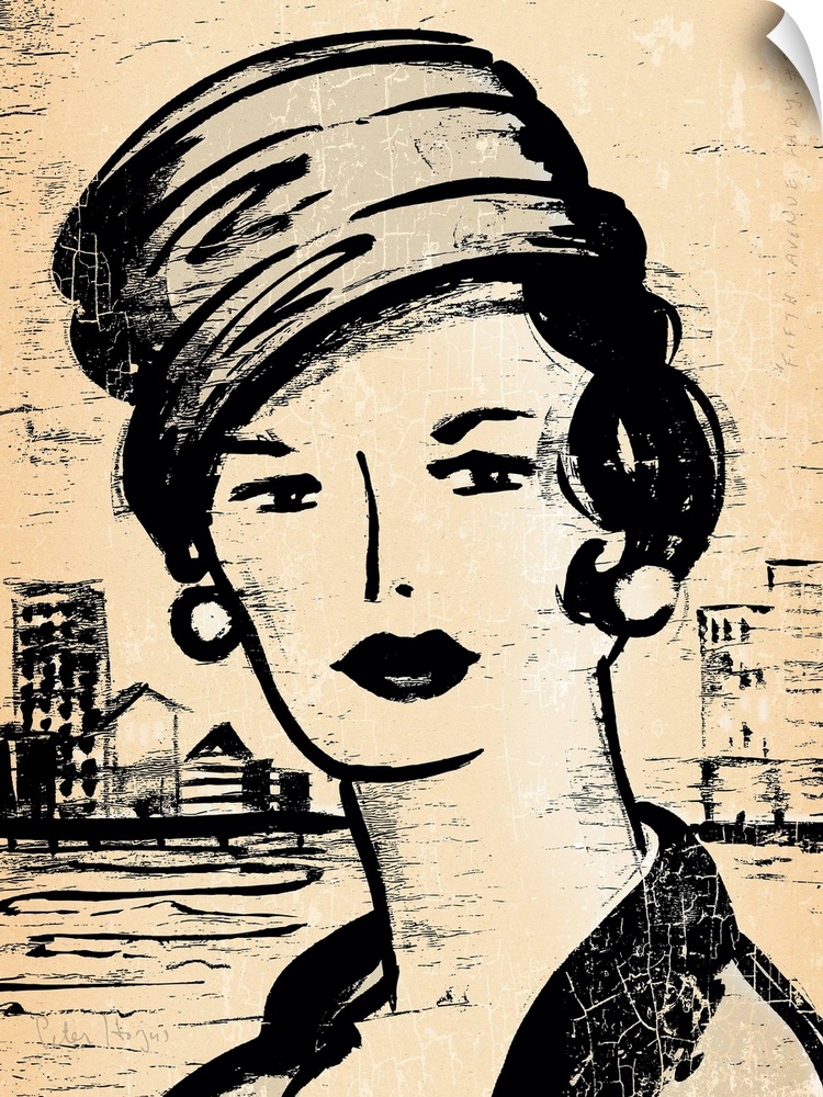 <p>1940's vintage wall art black ink brush illustration on sepia background of the head and shoulders of a fashionable woman.</p>