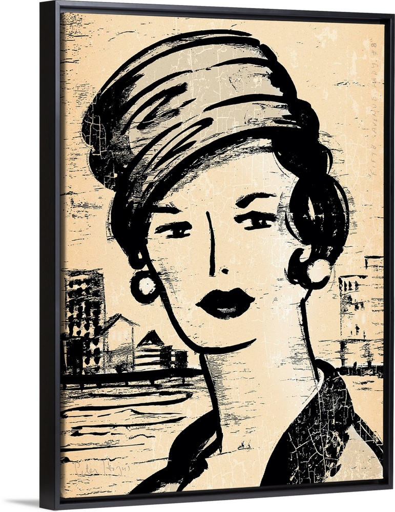 <p>1940's vintage wall art black ink brush illustration on sepia background of the head and shoulders of a fashionable woman.</p>