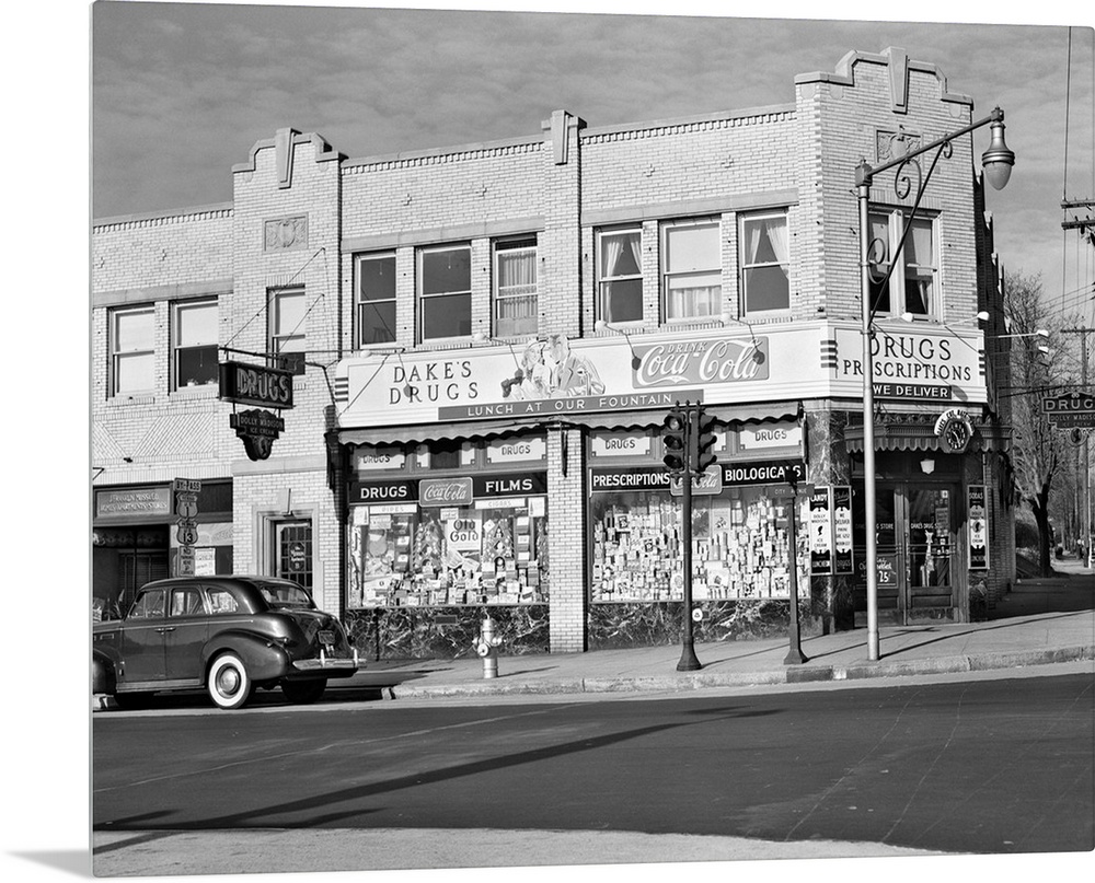 <p>1940's Storefront Drugstore Windows Full Of Products Advertising Lunch Fountain.</p>