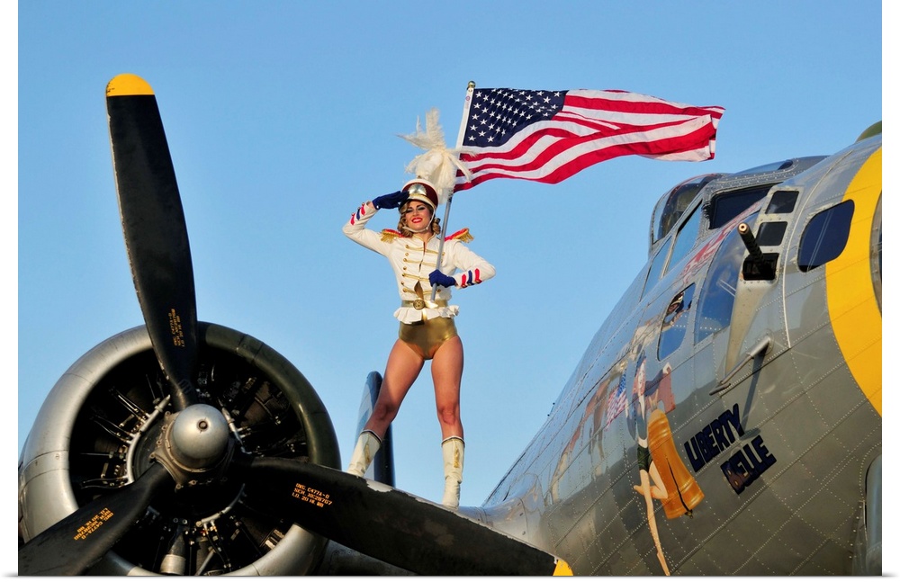<p>Patriotic 1940's style majorette pin-up girl standing on a B-17 bomber with an American flag.</p>