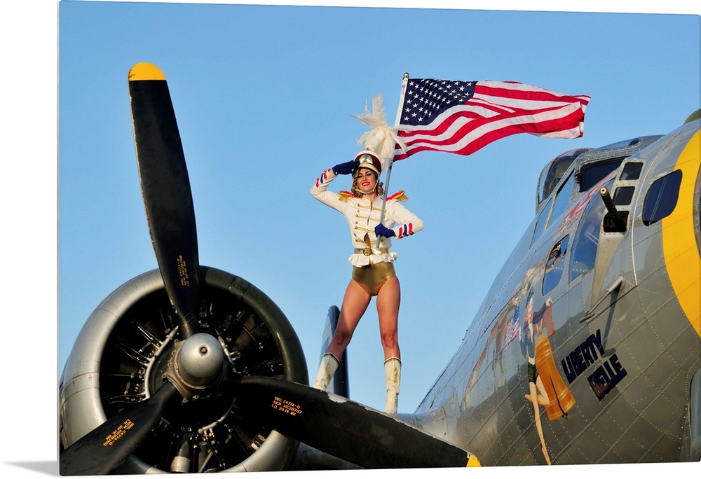 <p>Patriotic 1940's style majorette pin-up girl standing on a B-17 bomber with an American flag.</p>