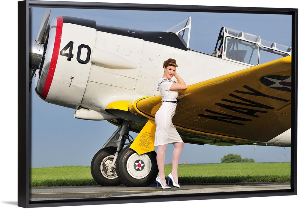 <p>1940's style Navy pin-up girl leaning on the wing of a T-6 Texan trainer aircraft.</p>