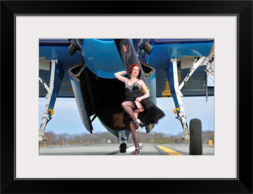 <p>Beautiful 1940's style pin-up girl in cocktail dress posing in front of a TBM Avenger.</p>