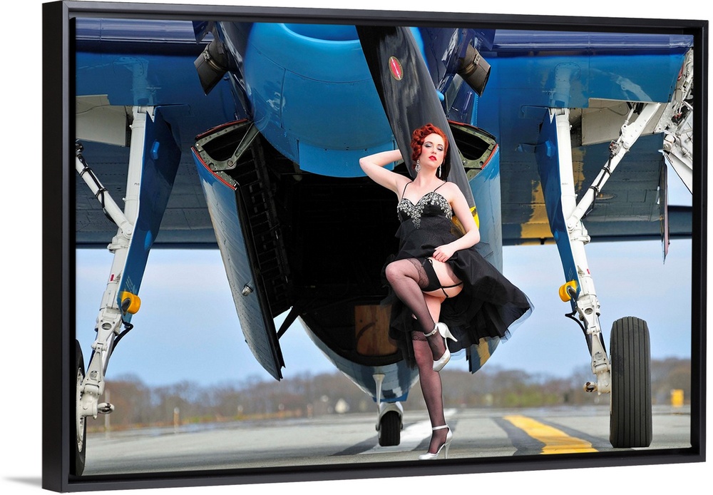 <p>Beautiful 1940's style pin-up girl in cocktail dress posing in front of a TBM Avenger.</p>