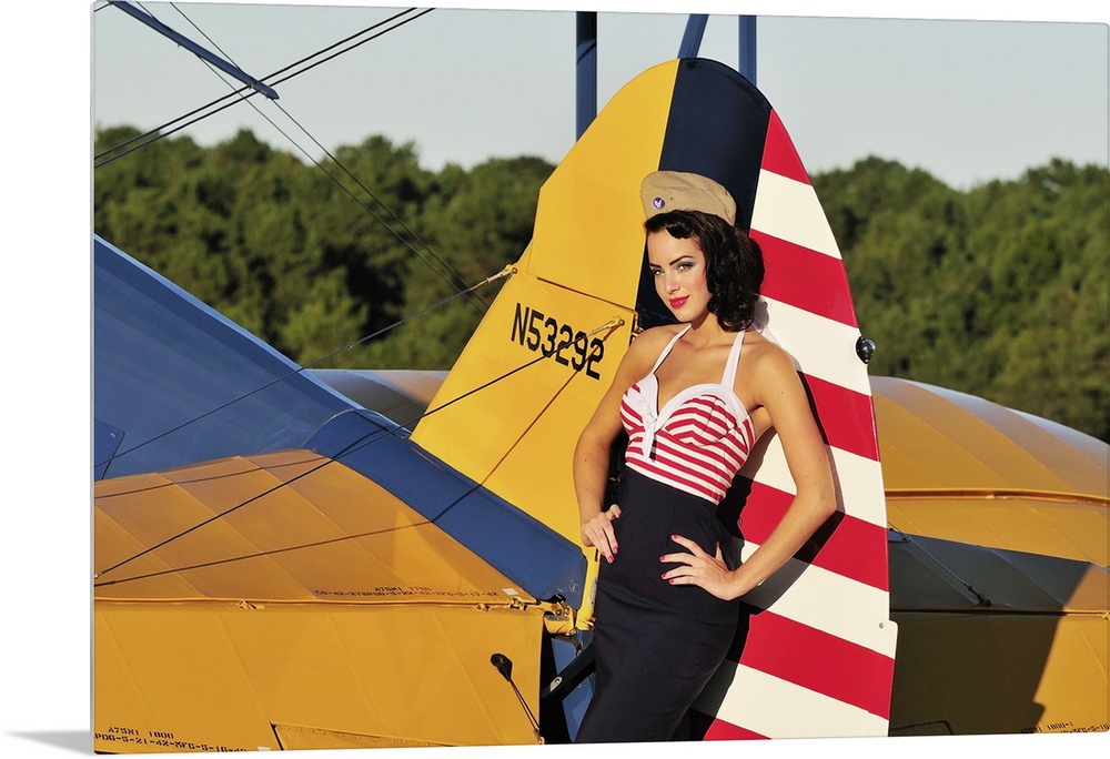 <p>Patriotic 1940's style pin-up girl leaning on the tail fin of a World War II Stearman biplane.</p>