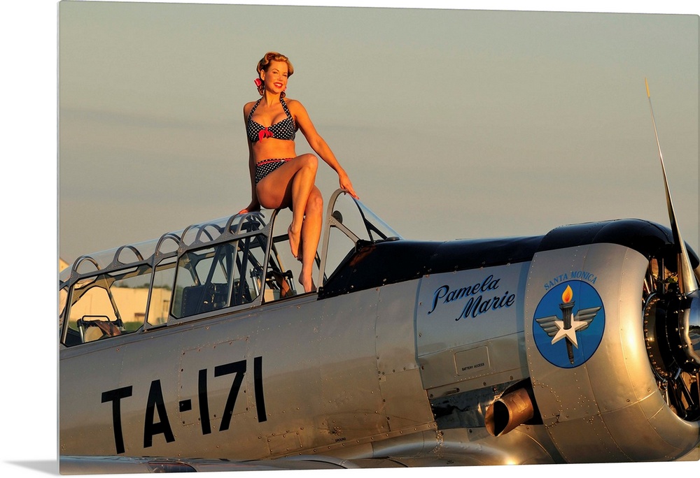 <p>1940's style pin-up girl sitting on the cockpit of a World War II T-6 Texan.</p>