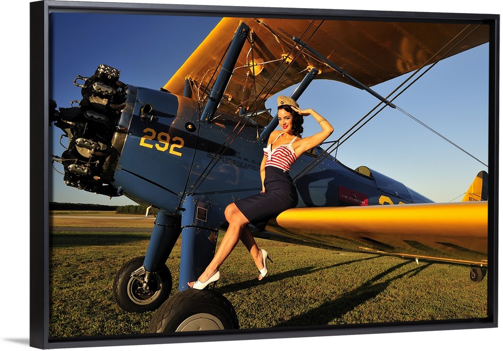 <p>Patriotic 1940's style pin-up girl sitting on the wing of a World War II Stearman biplane.</p>