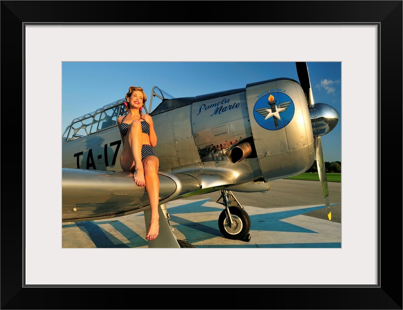 <p>1940's style pin-up girl sitting on the wing of a World War II T-6 Texan.</p>