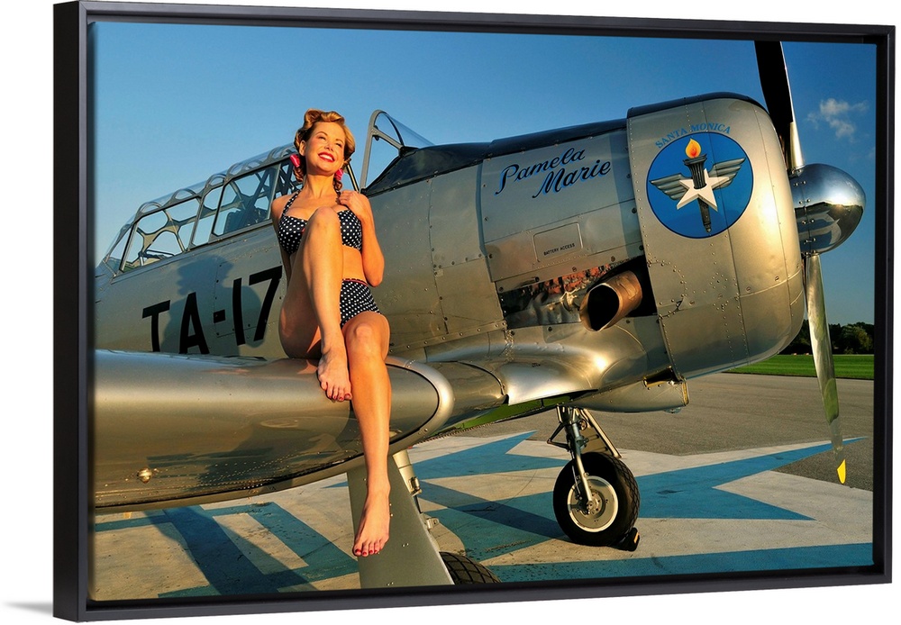 <p>1940's style pin-up girl sitting on the wing of a World War II T-6 Texan.</p>