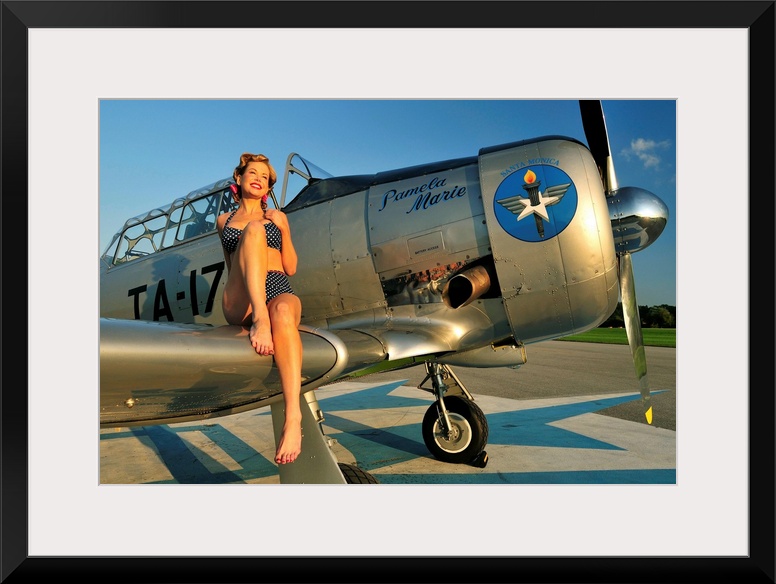 <p>1940's style pin-up girl sitting on the wing of a World War II T-6 Texan.</p>