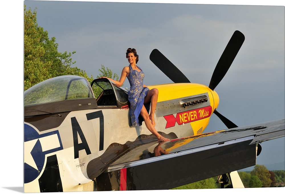 <p>Beautiful 1940's style pin-up girl standing barefoot on the wing of a P-51 Mustang.</p>