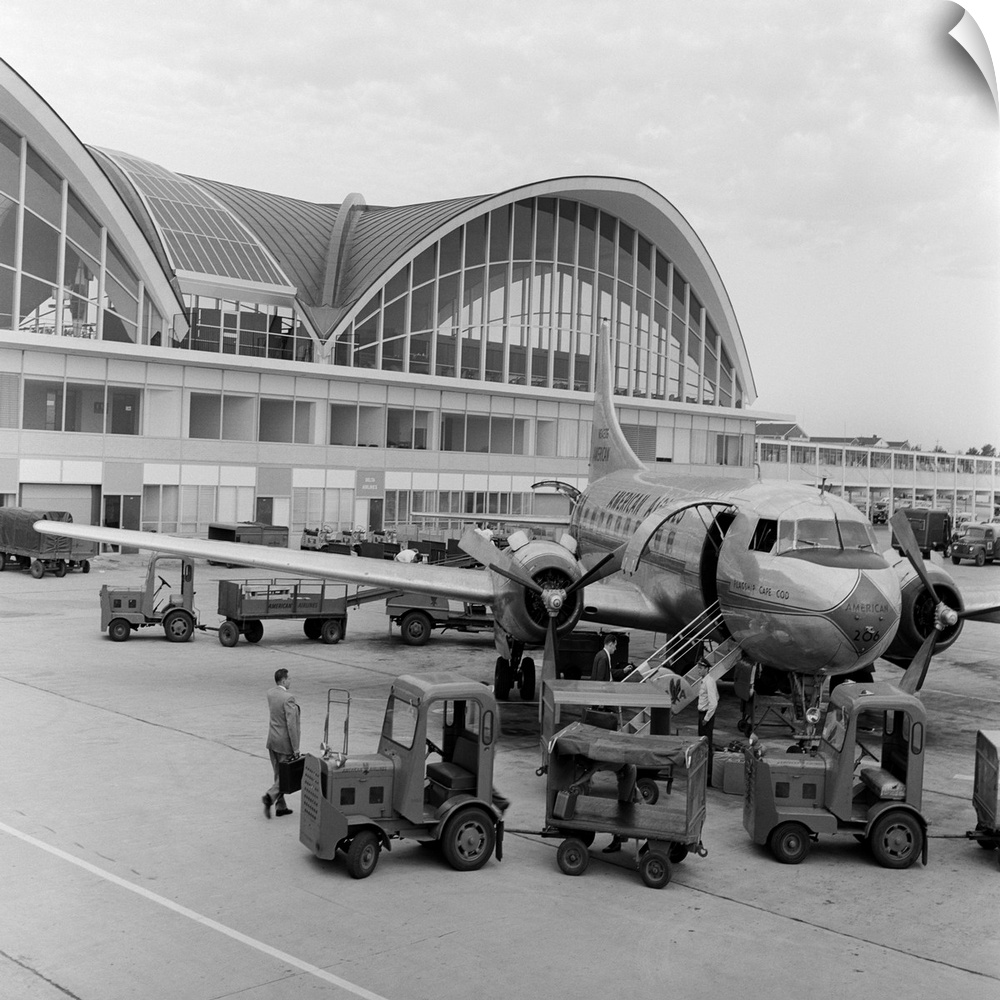 <p>1950s 1960s Propeller Airplane On Airport Tarmac In Front Of Terminal With Modern Arched Windows St. Louis Missouri USA.</p>