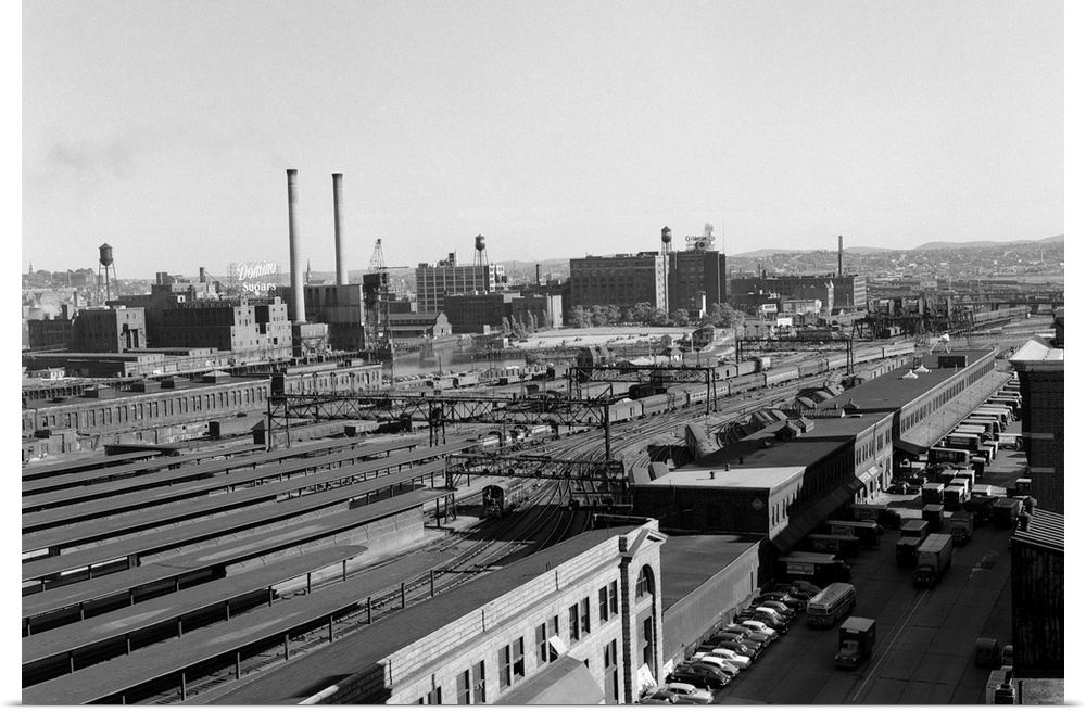 <p>1950's Aerial Of Railroad Yard At Industrial Site Surrounded By Factories.</p>