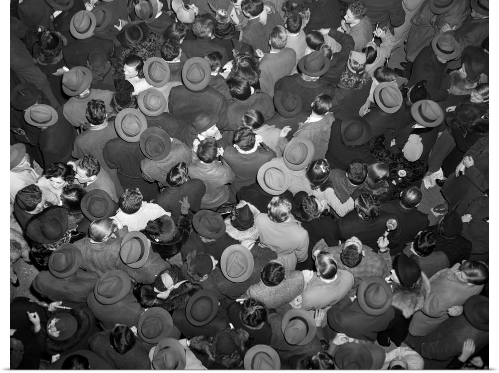 <p>1950s Aerial View Of Crowd Of Men And Women In Times Square Nyc Celebrating New Years Many Hats Outdoor.</p>