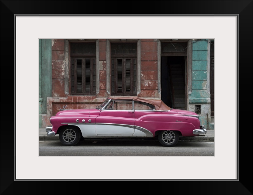 <p>1950s classic American pink car set against a traditional Cuban house.</p>