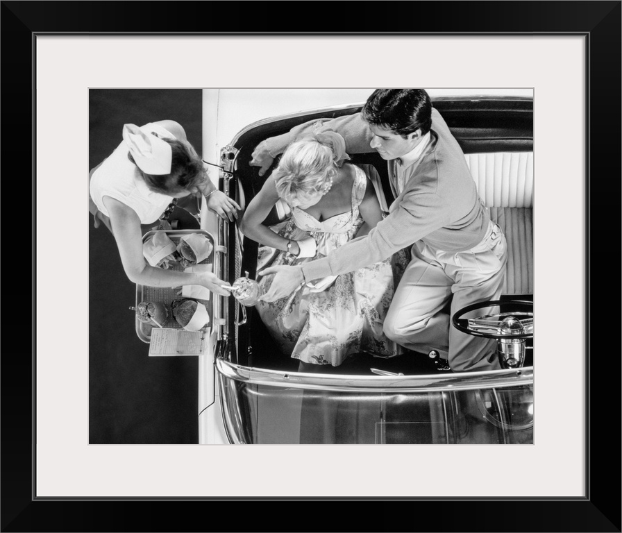 <p>1950s Drive-In Restaurant Carhop Waitress On Roller Skates Serving Couple In 1955 T-Bird Car Burgers And Milkshakes.</p>