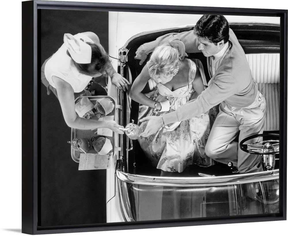 <p>1950s Drive-In Restaurant Carhop Waitress On Roller Skates Serving Couple In 1955 T-Bird Car Burgers And Milkshakes.</p>