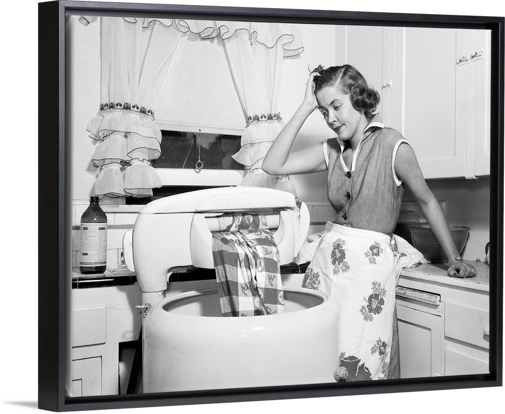 <p>1950s Frustrated Housewife With Jammed Wringer On Clothes Washing Machine In Kitchen.</p>