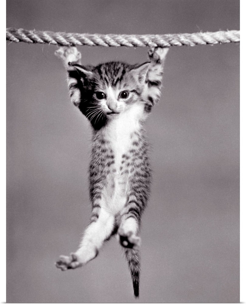 <p>1950s Little kitten hanging from rope looking at camera.</p>