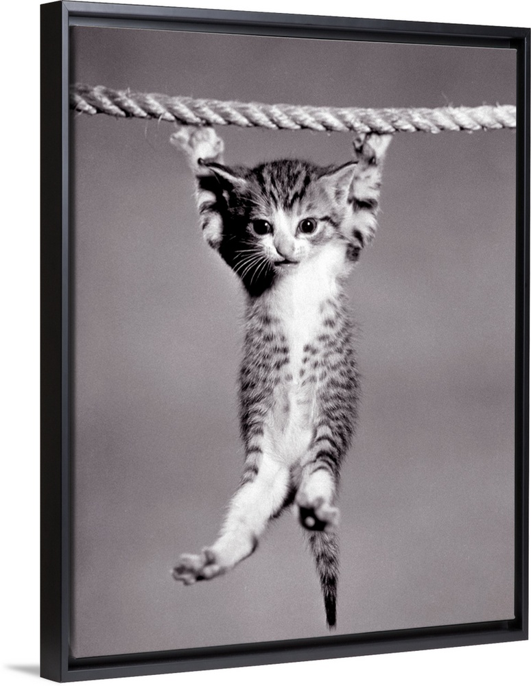 <p>1950s Little kitten hanging from rope looking at camera.</p>
