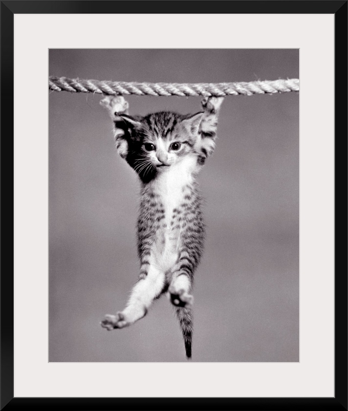 <p>1950s Little kitten hanging from rope looking at camera.</p>