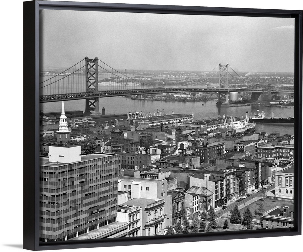 <p>1950's Philadelphia Pa USA Looking Northeast Past Delaware River Waterfront To Benjamin Franklin Suspension Bridge To Camden Nj.</p>