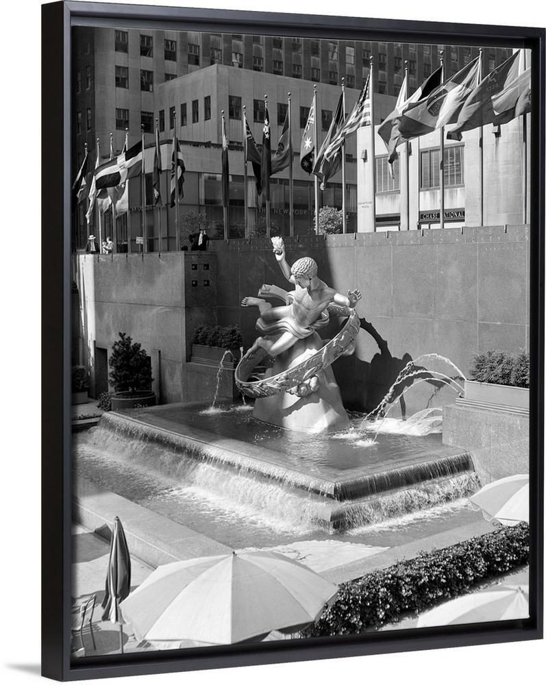 <p>1950's Rockefeller Center Prometheus Fountain By Paul Manship And United Nations Flags New York City NY USA.</p>