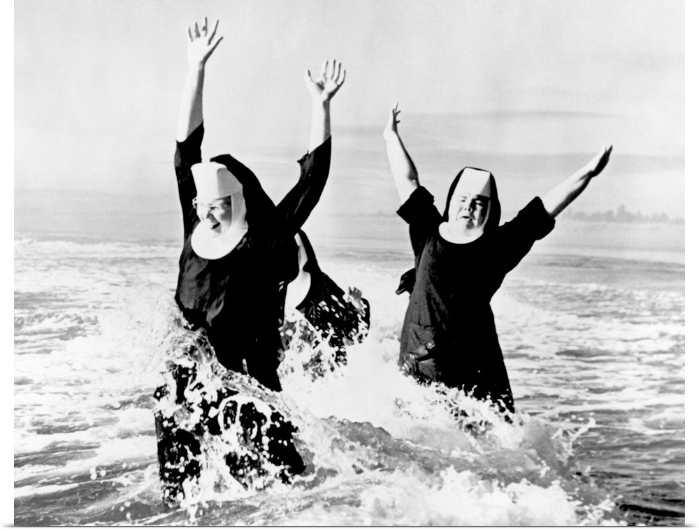 <p>1950s Three nuns wearing habits laughing jumping in ocean surf.</p>
