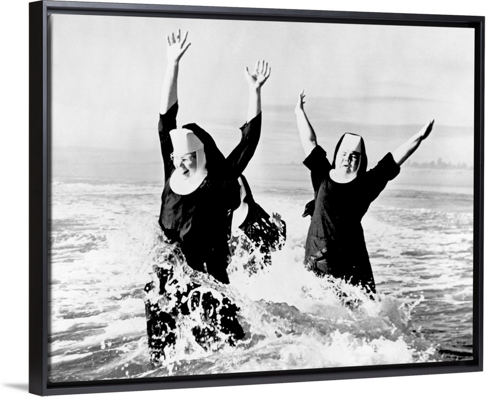 <p>1950s Three nuns wearing habits laughing jumping in ocean surf.</p>