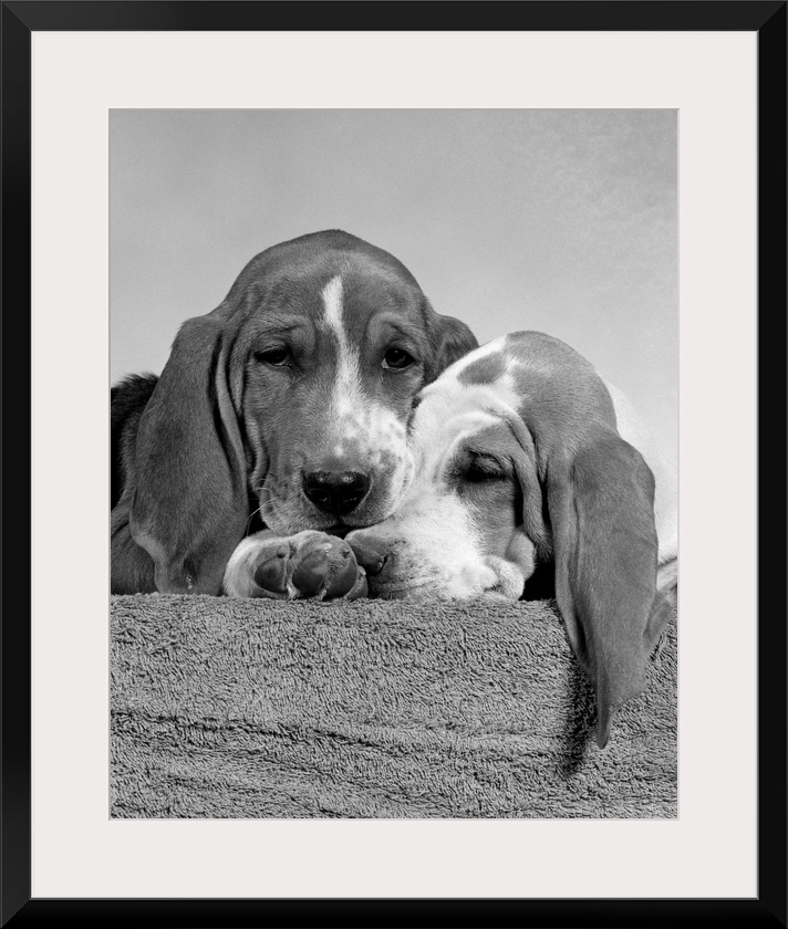 <p>1950s Two Sad Looking Twelve Week Old Basset Hound Puppies Nestled Together.</p>