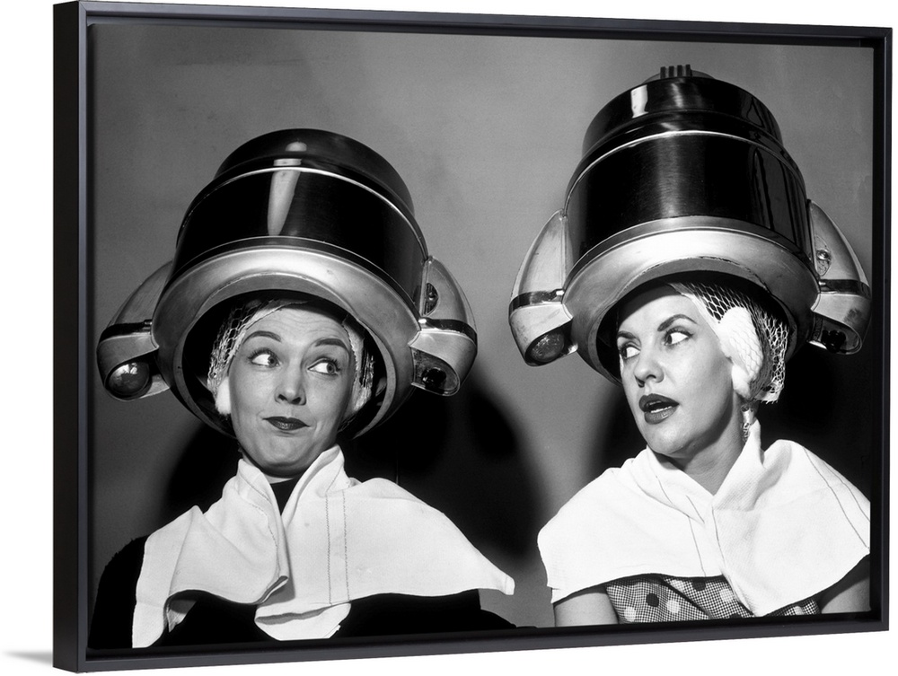 <p>1950s Two Women Sitting Together Gossiping Under Hairdresser Hair Dryer.</p>