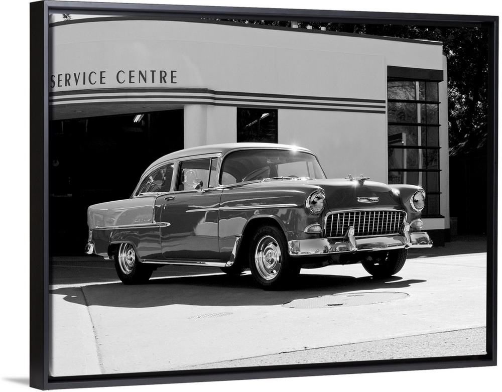 <p>Black and white photograph of a 1955 Chev Belair 7 in front of a service center.</p>