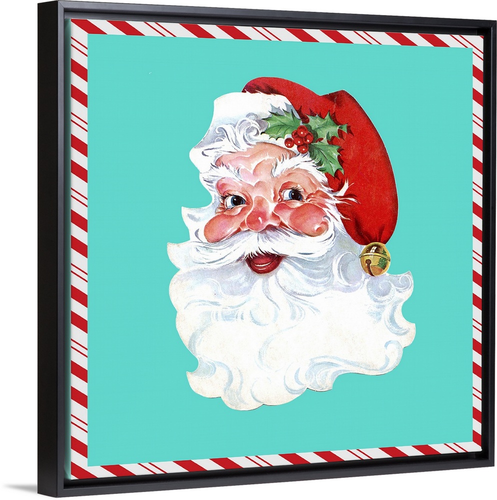 <p>Square vintage artwork of a smiling Santa on a teal background bordered with a candy cane pattern.</p>
