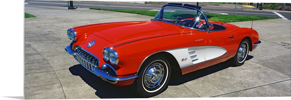 <p>This panoramic photograph shows a vintage muscle car convertible parked on pavement.</p>