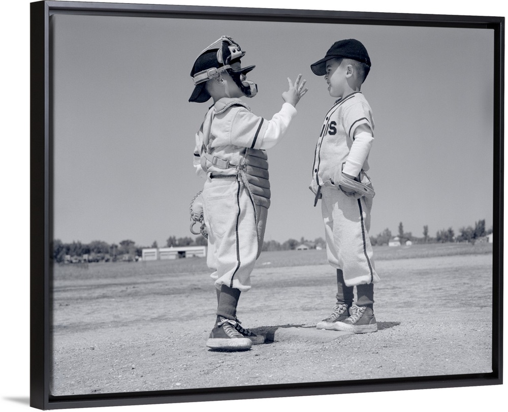 <p>1960s Boy Little Leaguer Pitcher Arguing With Catcher.</p>