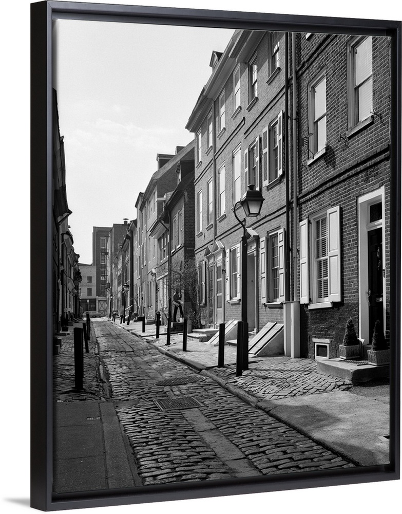 <p>1960's Elfreth's Alley A Narrow Colonial Belgian Block Street Lined With Quaint Row Homes Philadelphia Pennsylvania USA.</p>