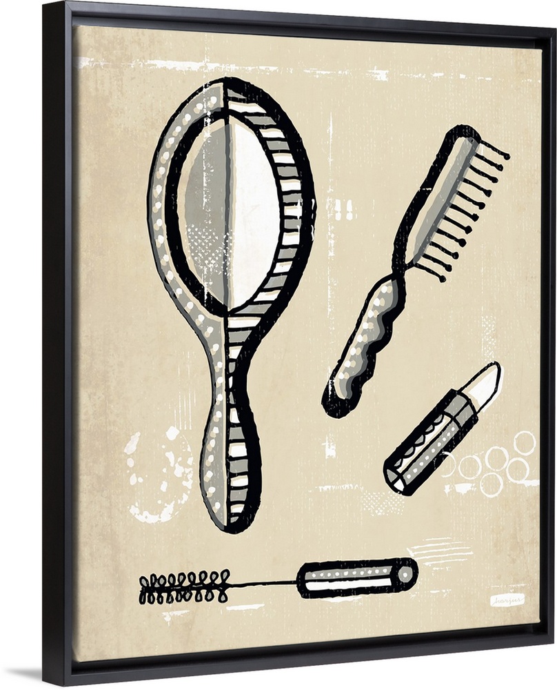 <p>1960's vintage style wall art of cosmetics illustrated in black pen and ink line on distressed sepia paper.</p>