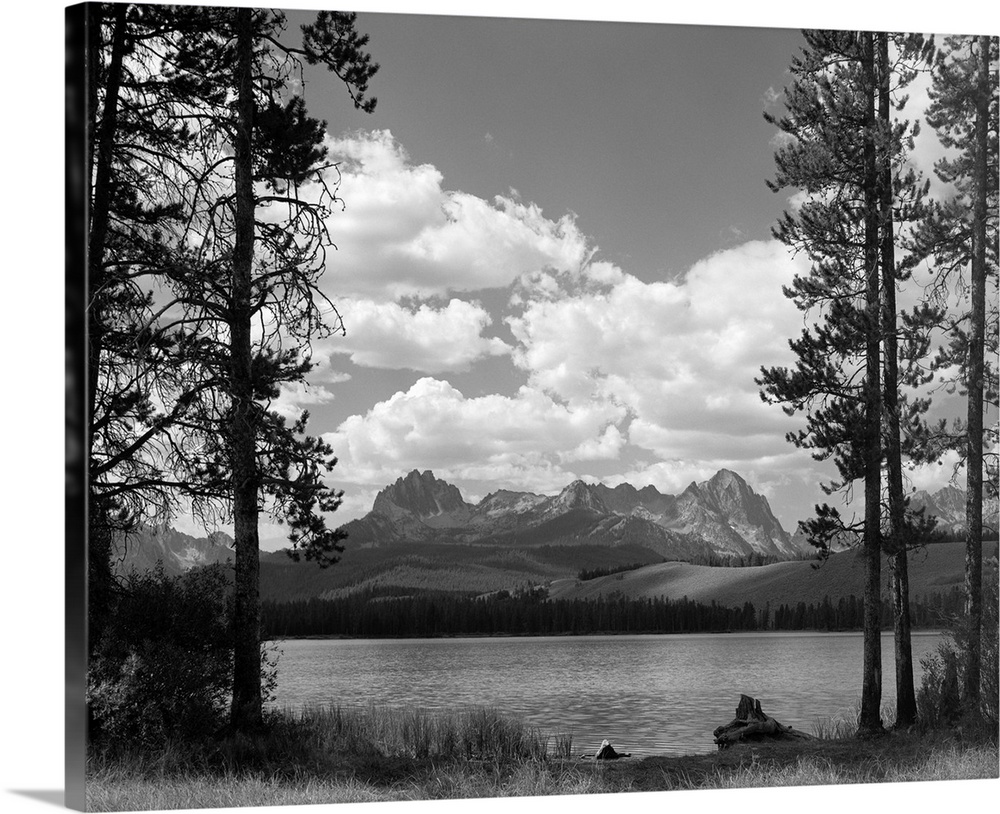 <p>1960's Little Red Fish Lake In Idaho With Saw Tooth Mountains In Background Viewed Between Clearing In Trees.</p>